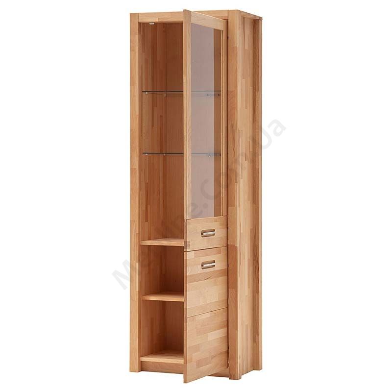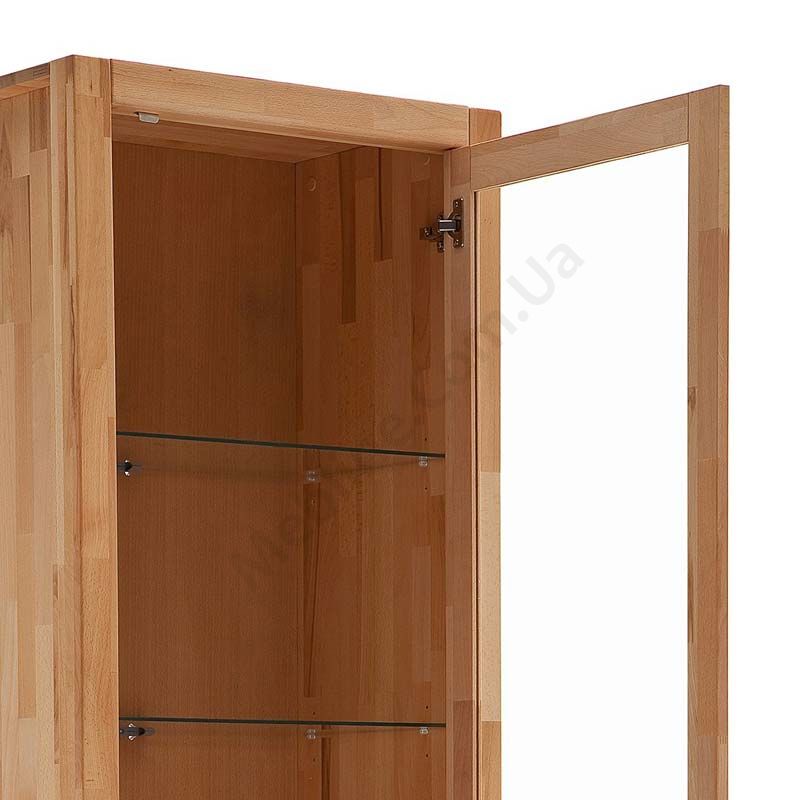 Дерев’яна вітрина з однією скляною та одними дерев’яними дверцятами.