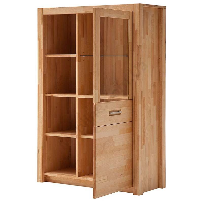 Дерев’яний сервант з відкритими полицями та скляними дверцятами.
