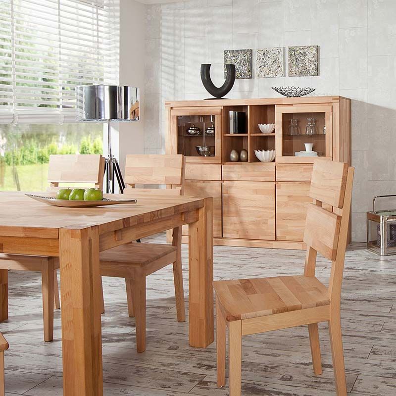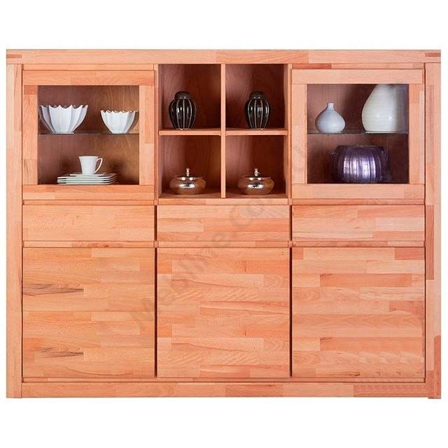 Дерев’яний сервант зі скляними дверцятами, висувними шухлядами та відкритими полицями.