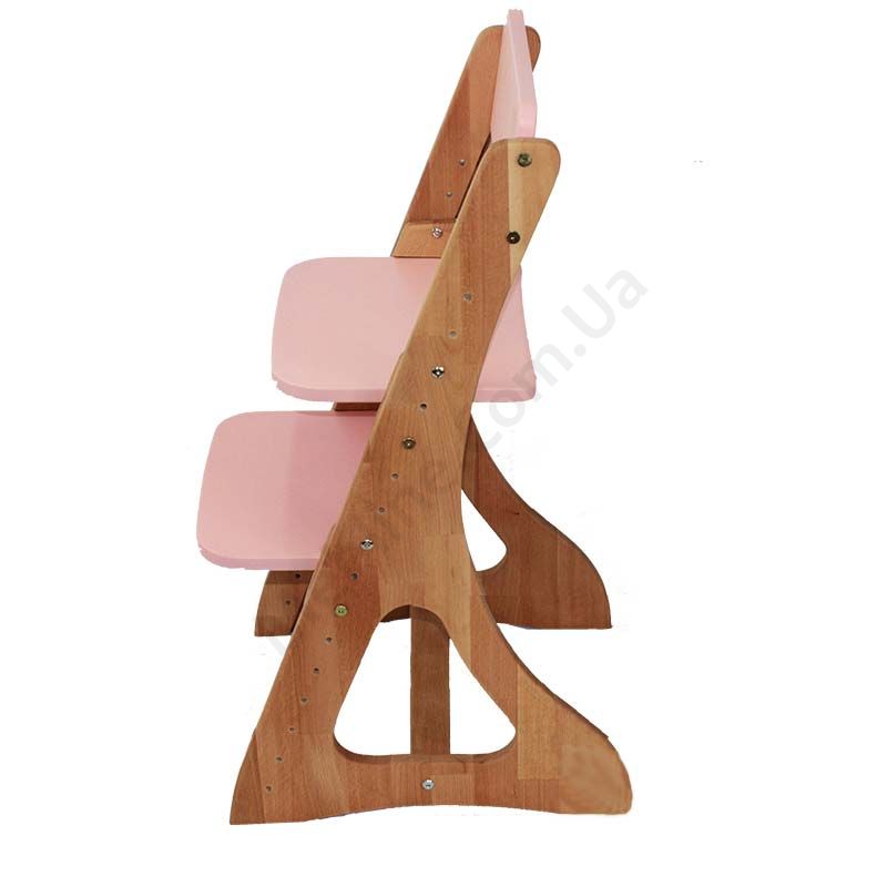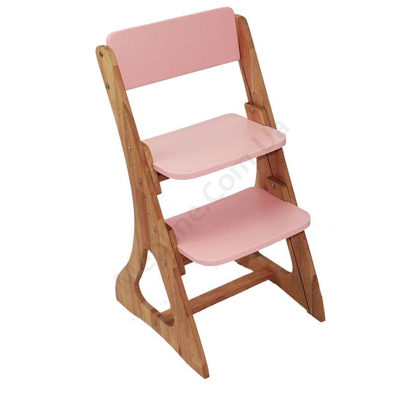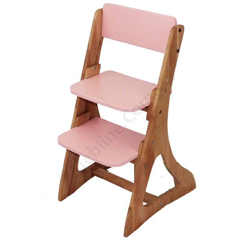 Рожевий дерев’яний зростаючий стілець з регулюванням висоти сидіння та підніжкою.