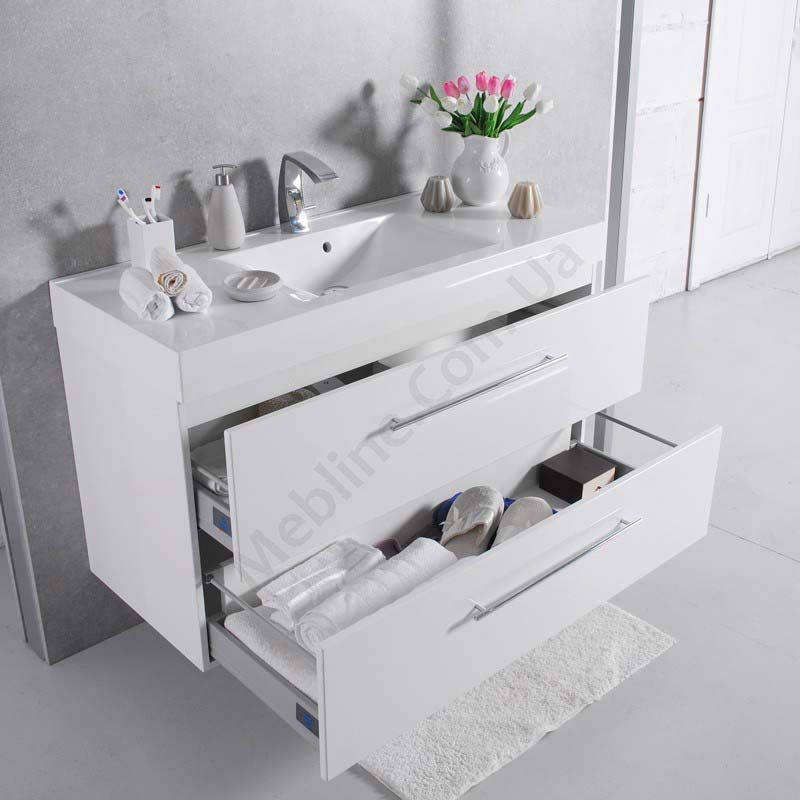 Навісна біла шафка для ванної з умивальником та висувними шухлядами.