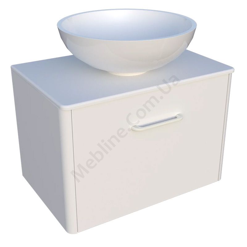 Навісна біла тумба для ванної з умивальником-чашею та висувною шухлядою.