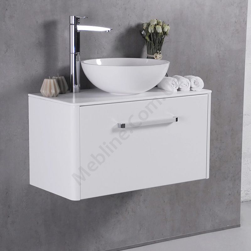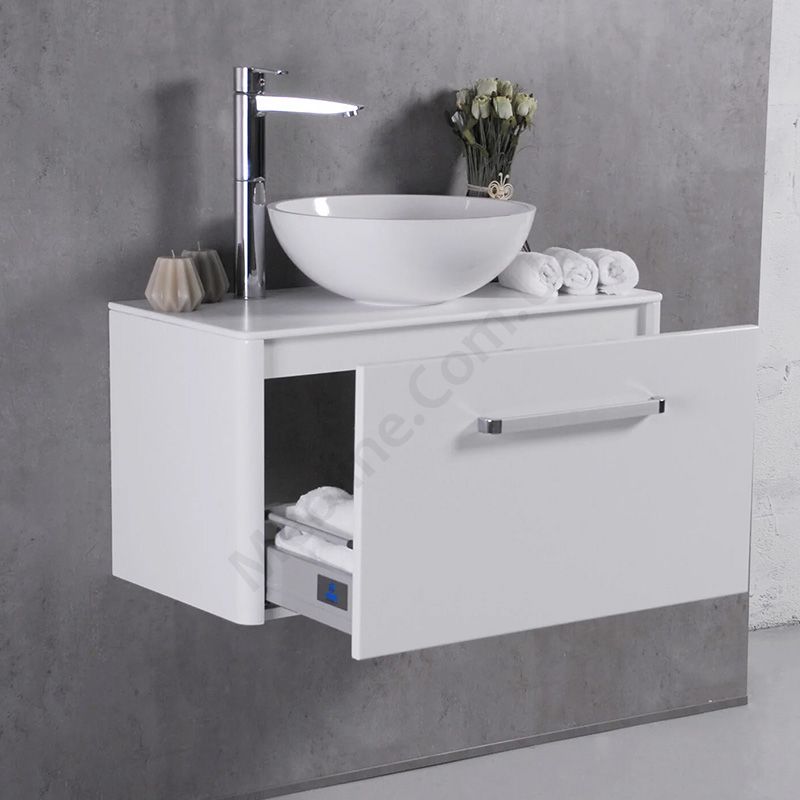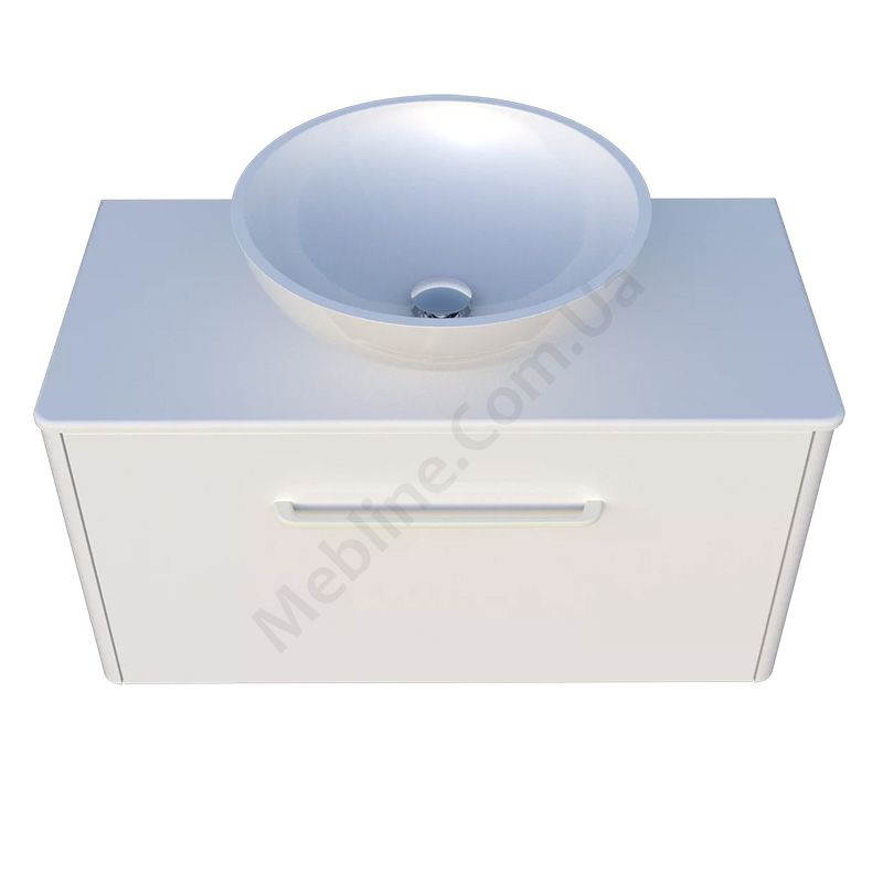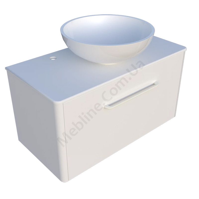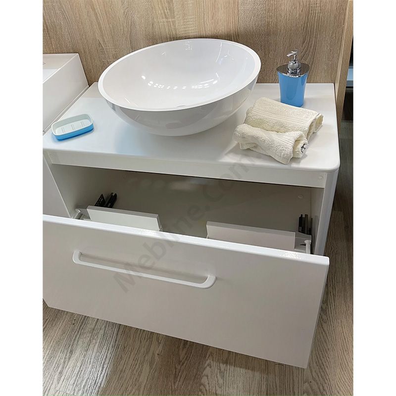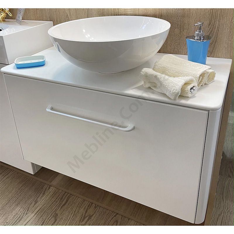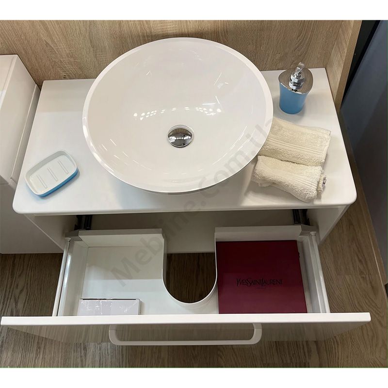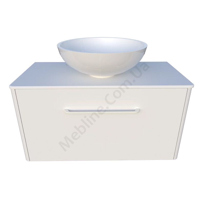 Навісна біла тумба для ванної з умивальником-чашею та висувною шухлядою.