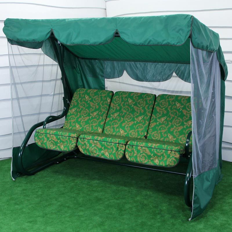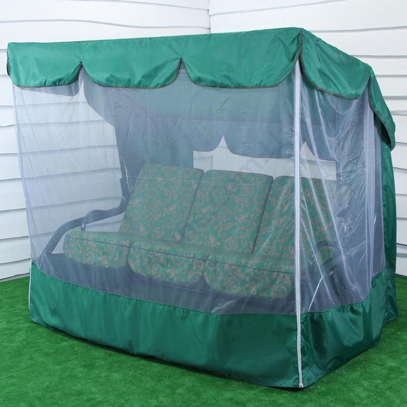 Садова гойдалка з відкидною спинкою та москітною сіткою на зеленому каркасі.