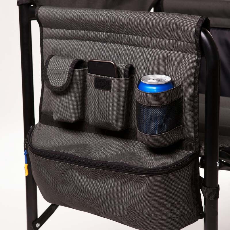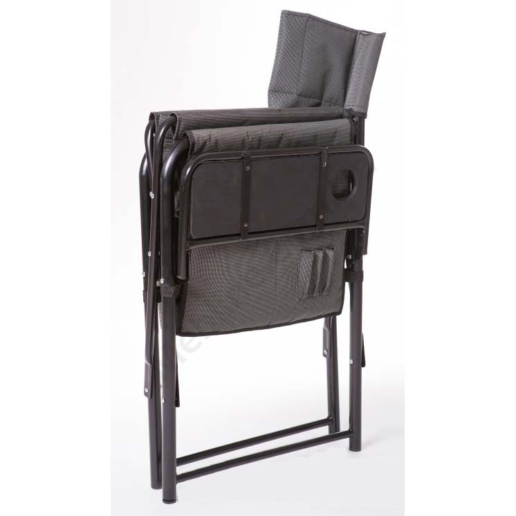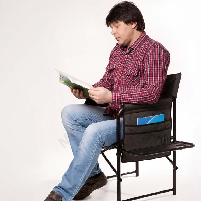 Складаний стілець зі спинкою, підлокітниками та полицею.