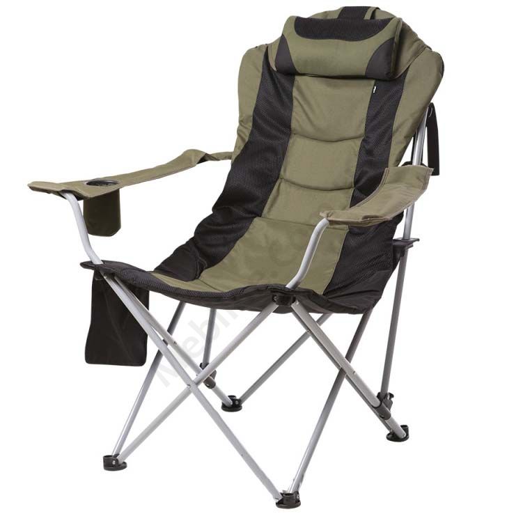 Широкий міцний складаний стілець зеленого кольору з регульованою спинкою.