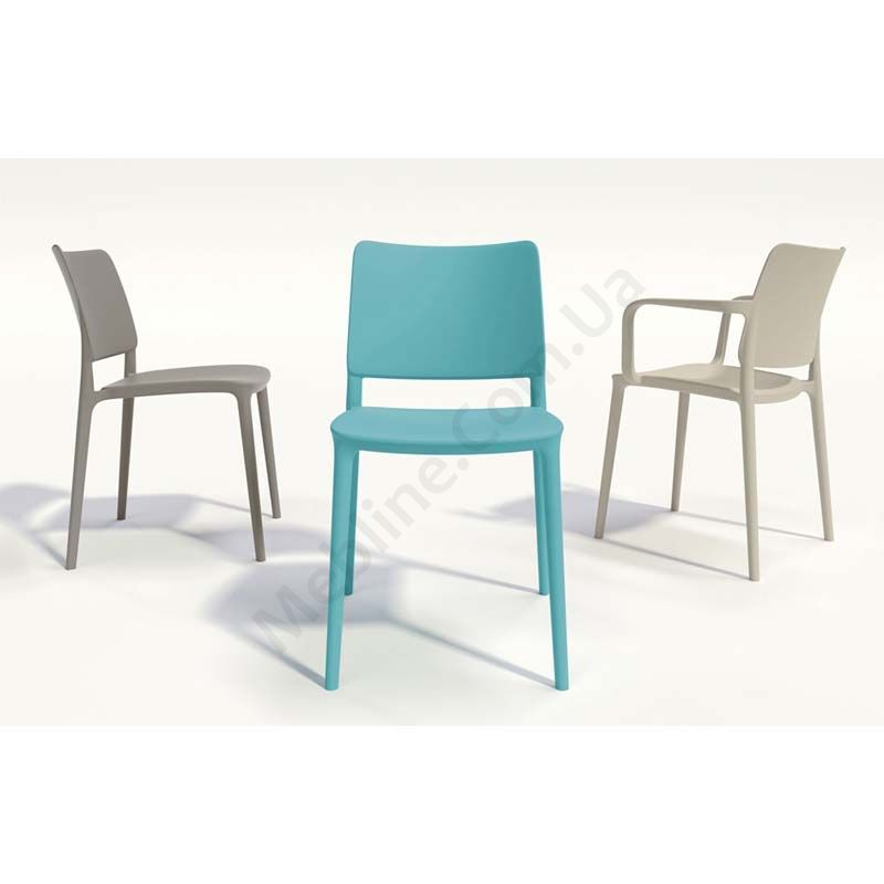 Міцний пластиковий стілець зі спинкою сірого кольору.