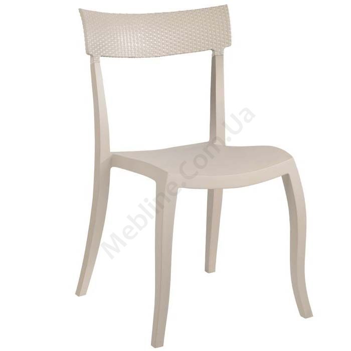 Піщано-бежевий пластиковий стілець зі спинкою.