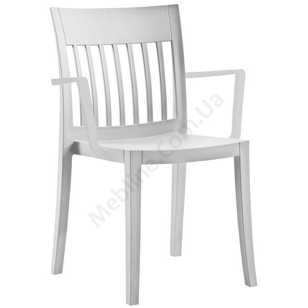 Пластиковий дизайнерський стілець з гратчастою спинкою та підлокітниками світло-сірого кольору.