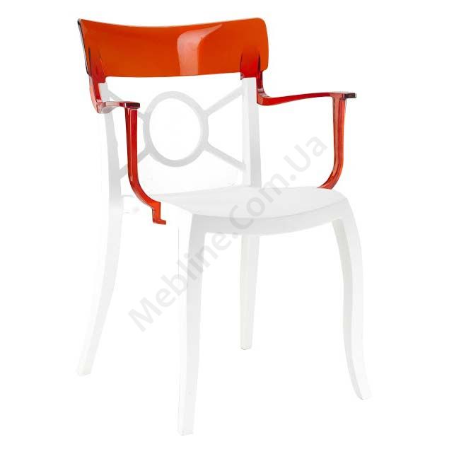 Пластиковий дизайнерський стілець з прозорою оригінальною спинкою та підлокітниками червоного кольору.