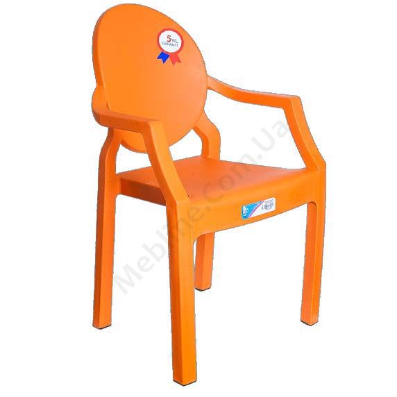 Дитячий пластиковий стілець помаранчевого кольору з підлокітниками.