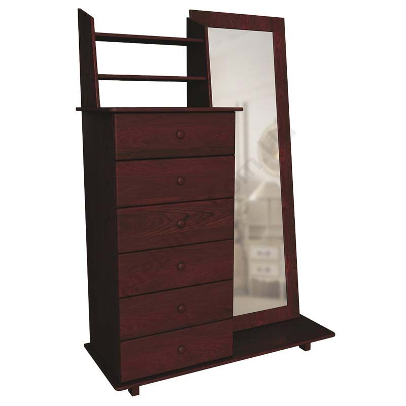 Комод з натурального дерева з високим дзеркалом, висувними шухлядами та відкритими полицями.