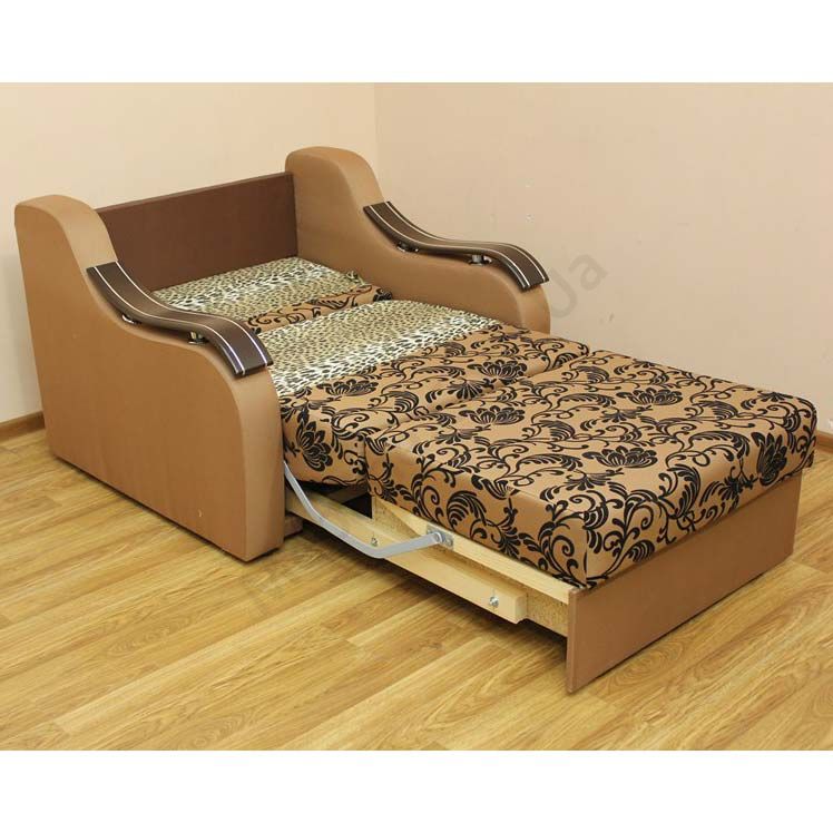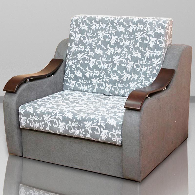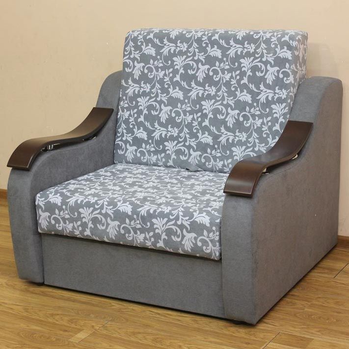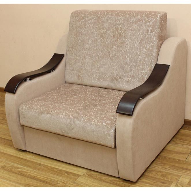 М’яке розкладне крісло з дерев’яними підлокітниками.