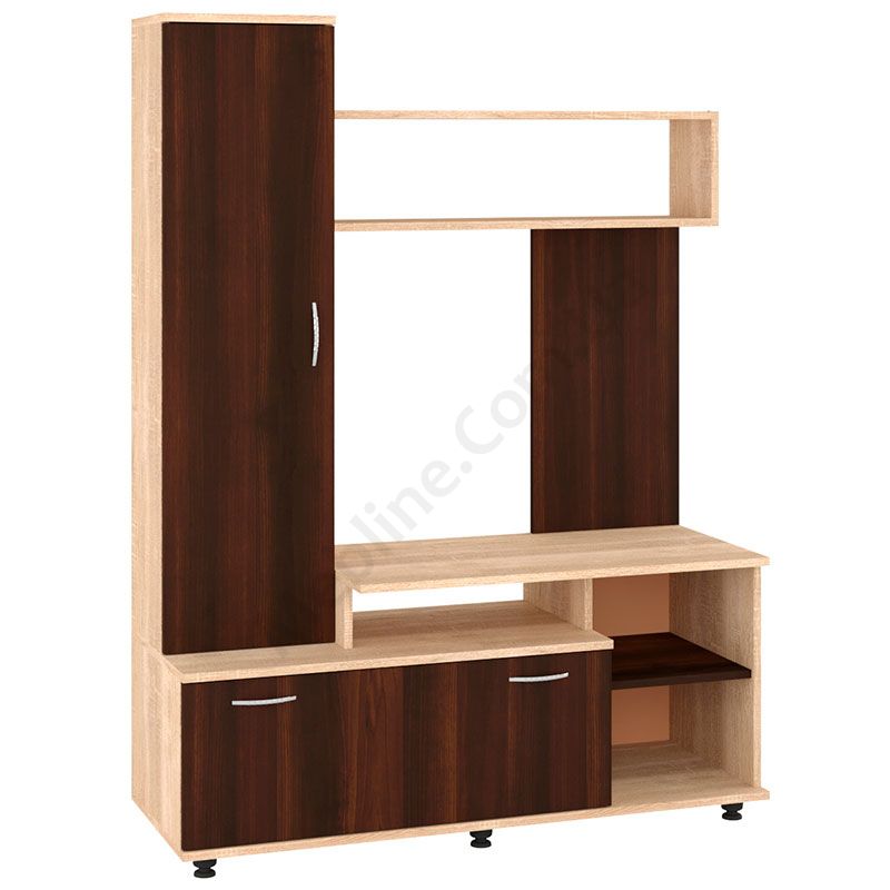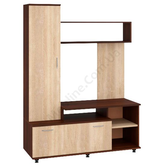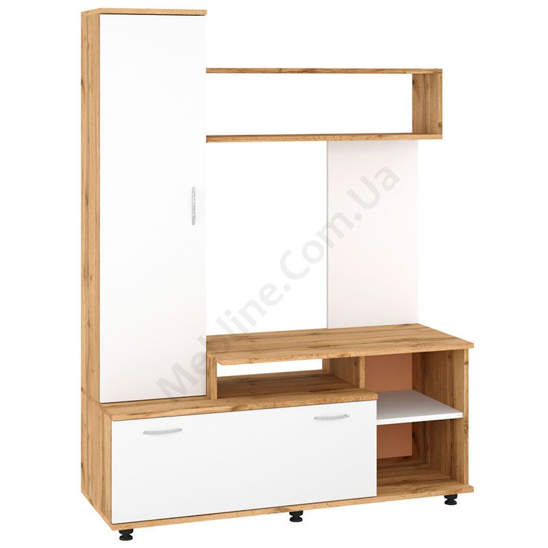 Тумба під телевізор з дверцятами та відкритими полицями.
