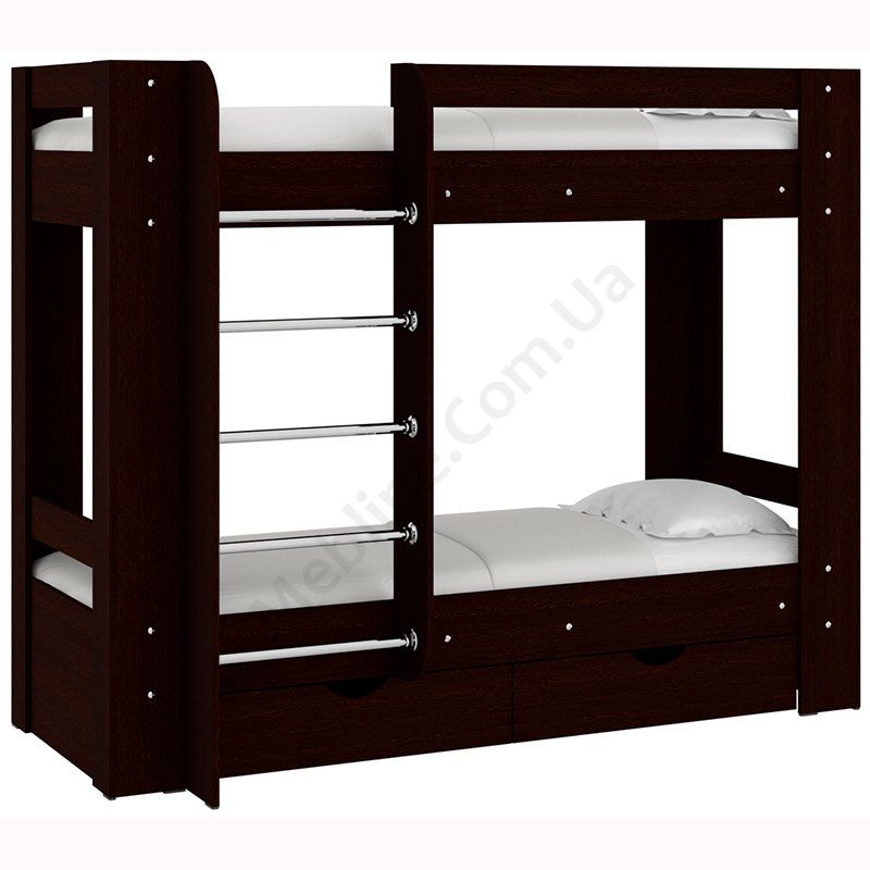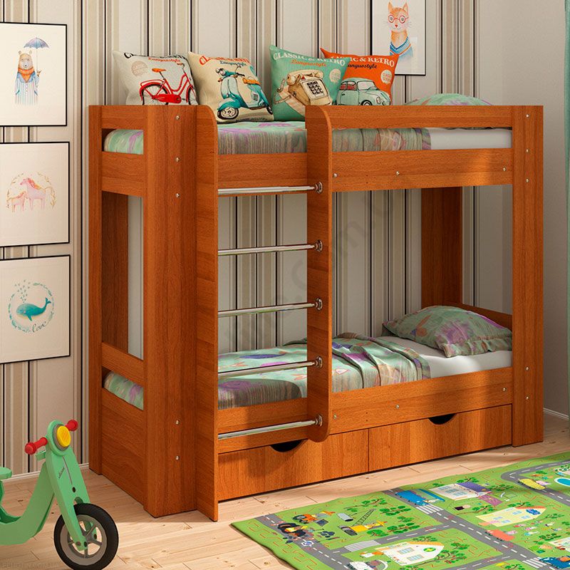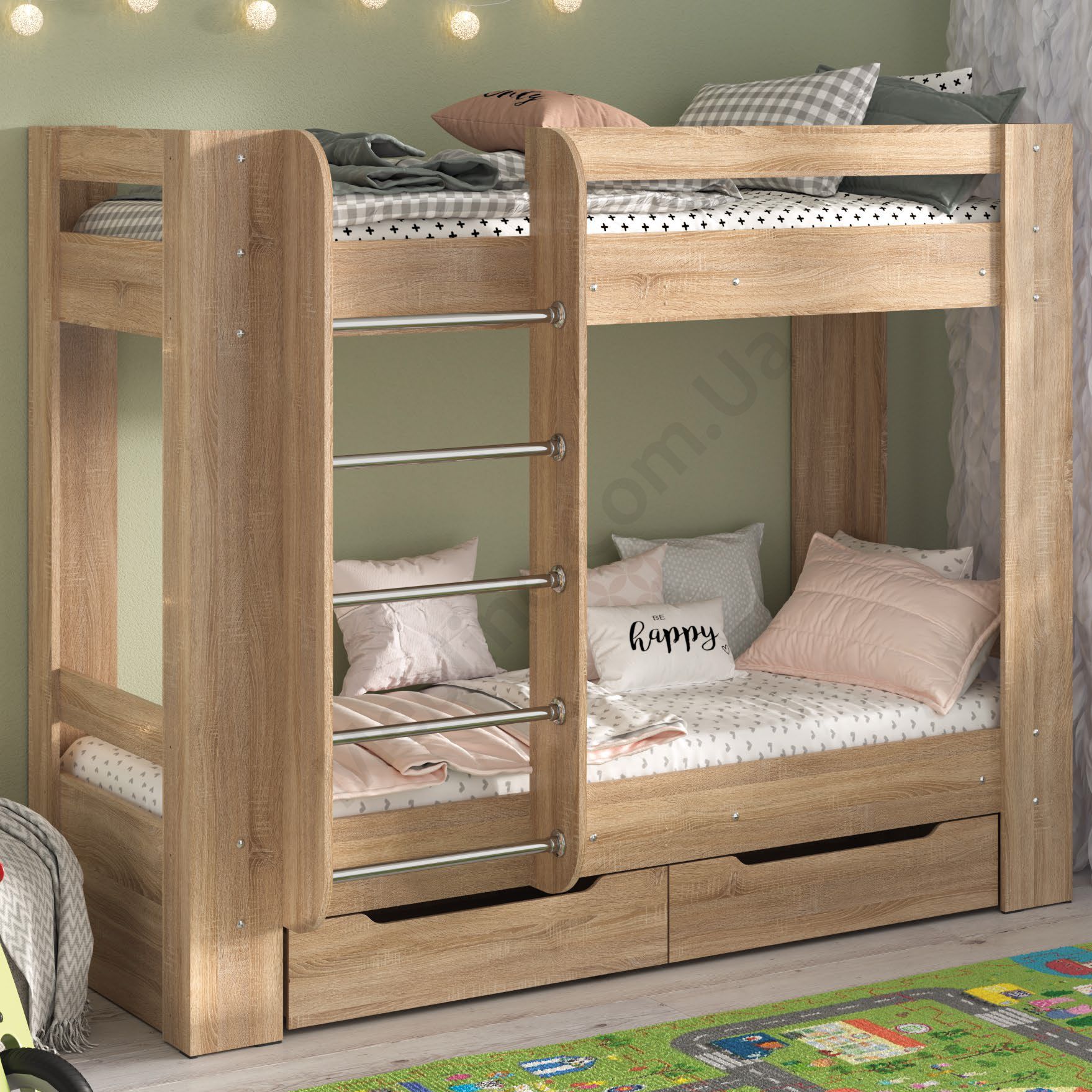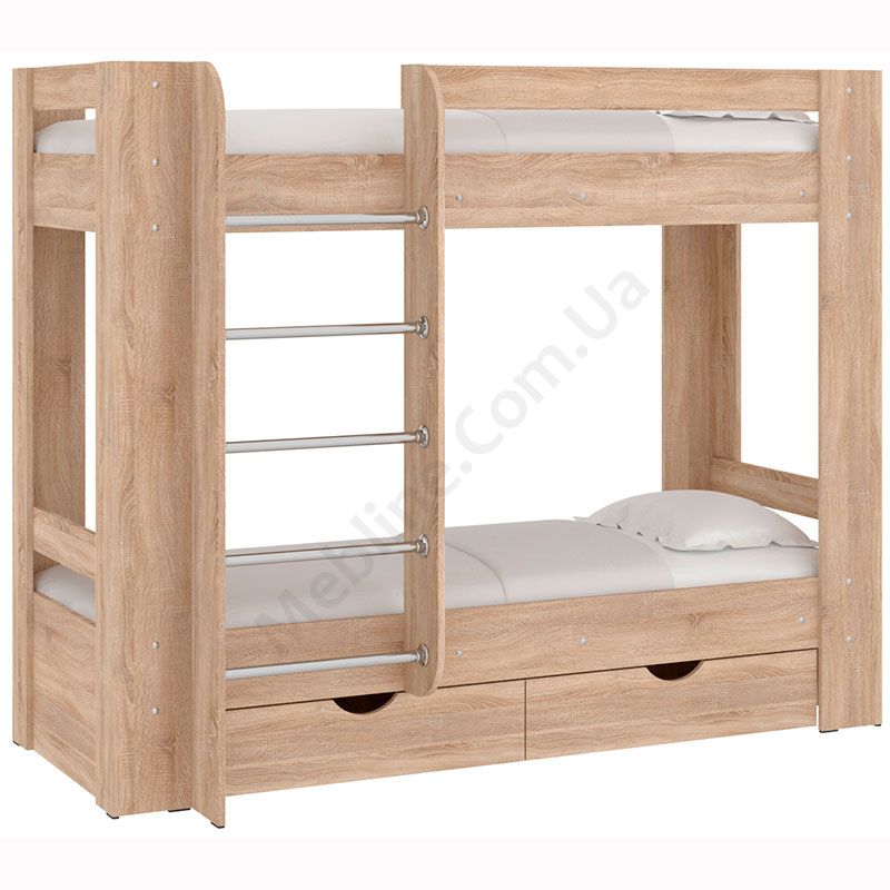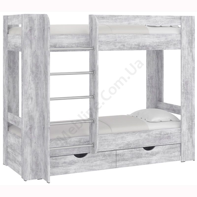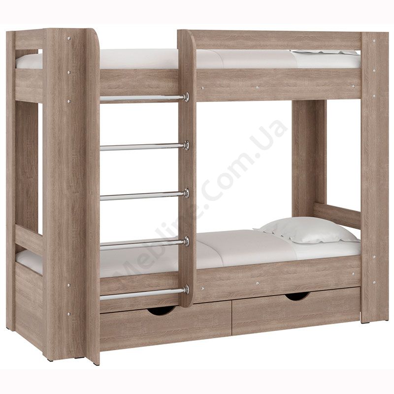 Двох’ярусне ліжко зі сходами і шухлядами для зберігання.