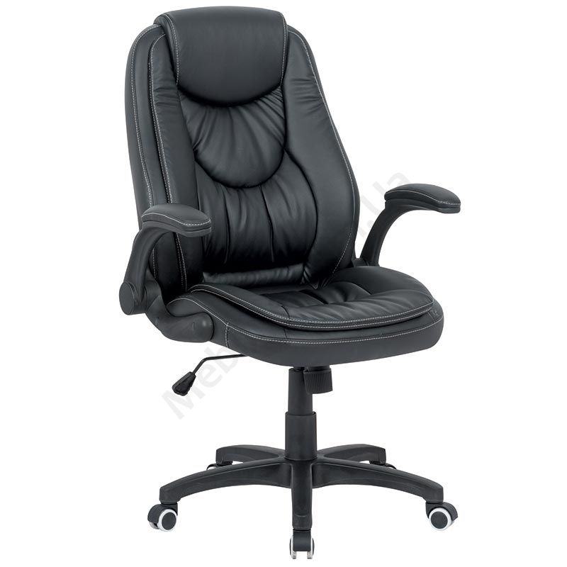 Чорне крісло для керівника з регульованими підлокітниками та режимом хитання.