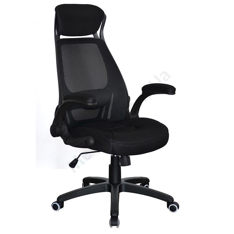 Чорне крісло для керівника з сітчастою спинкою, режимом хитання та регульованими підлокітниками.