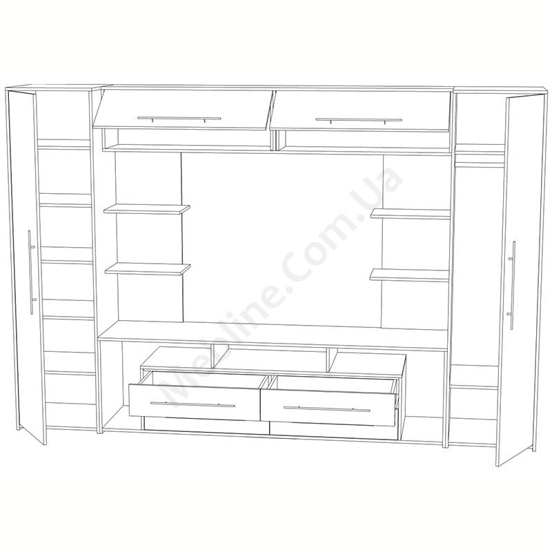 Корпус виконаний з ламінованої ДСП, завтовшки 16 мм.Фасад — МДФ, завтовшки 16 мм з ПВХ плівкою.Кромка торцевих поверхонь — ПВХ, завтовшки 0, 5 мм.Фурнітура — DC та Linken.Пенал з шістьма полицями всередині.Однодверна шафа зі штангою для одягу та двома полицями.Тумба під телевізор з чотирма висувними шухлядами та відкритими полицями.Верхні шкафчики відкриваються вгору.