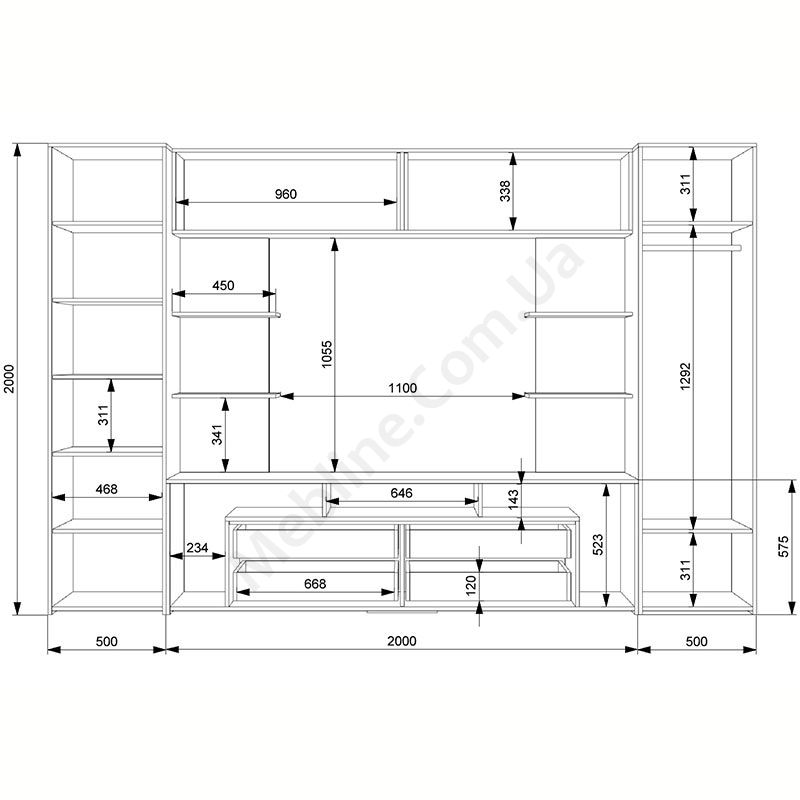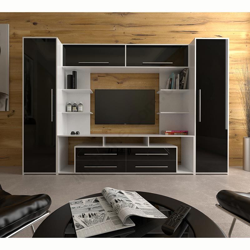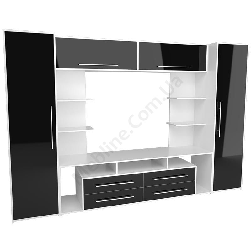 Стінка в вітальню з тумбою під телевізор, шафами та відкритими полицями.