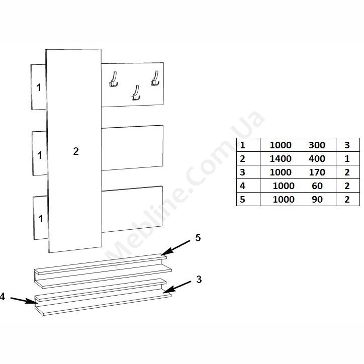 Виконано з ламінованої ДСП "Krono Україна", завтовшки 16 мм.Екологічна безпека класу Е-1.Кромка — протиударна ПВХ, завтовшки 0, 5 мм.Фурнітура — DC та Linken.
