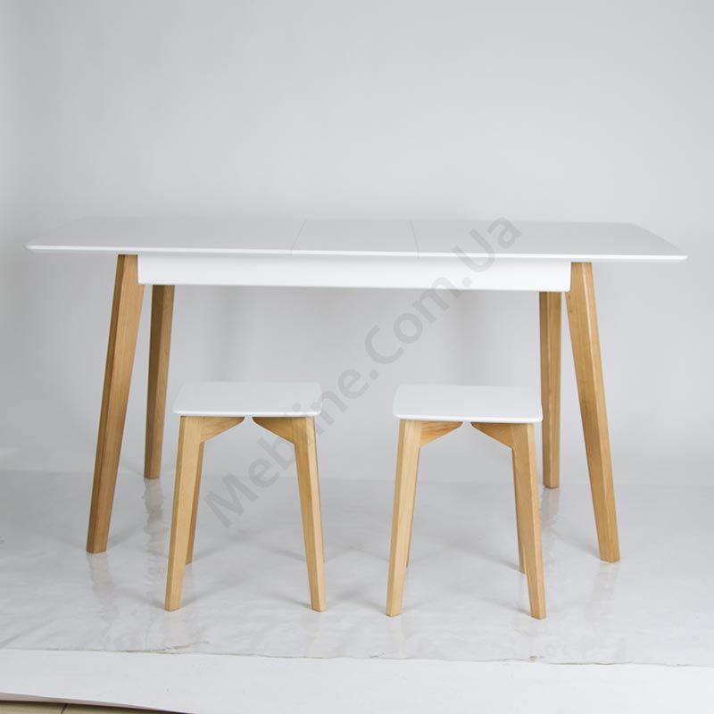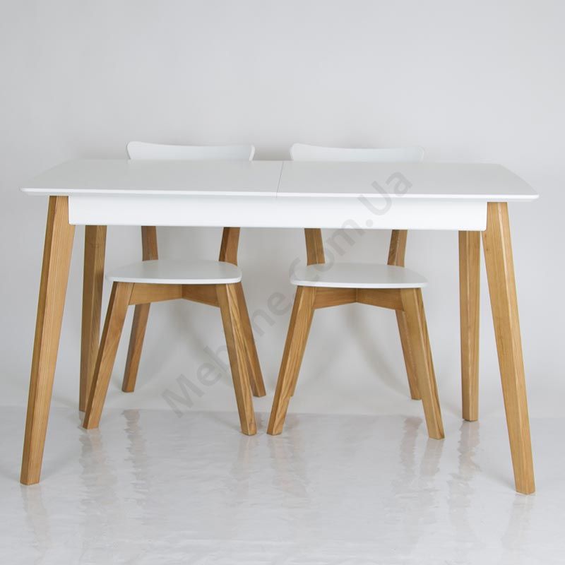 Розкладний обідній стіл із натурального дерева з білою стільницею.