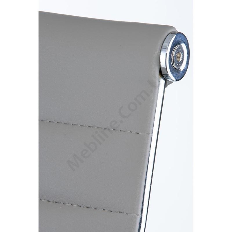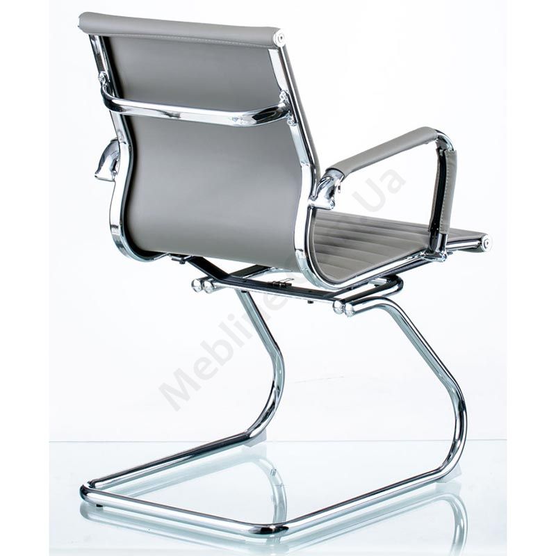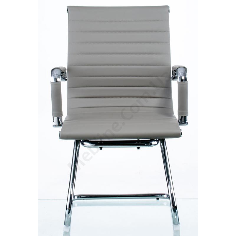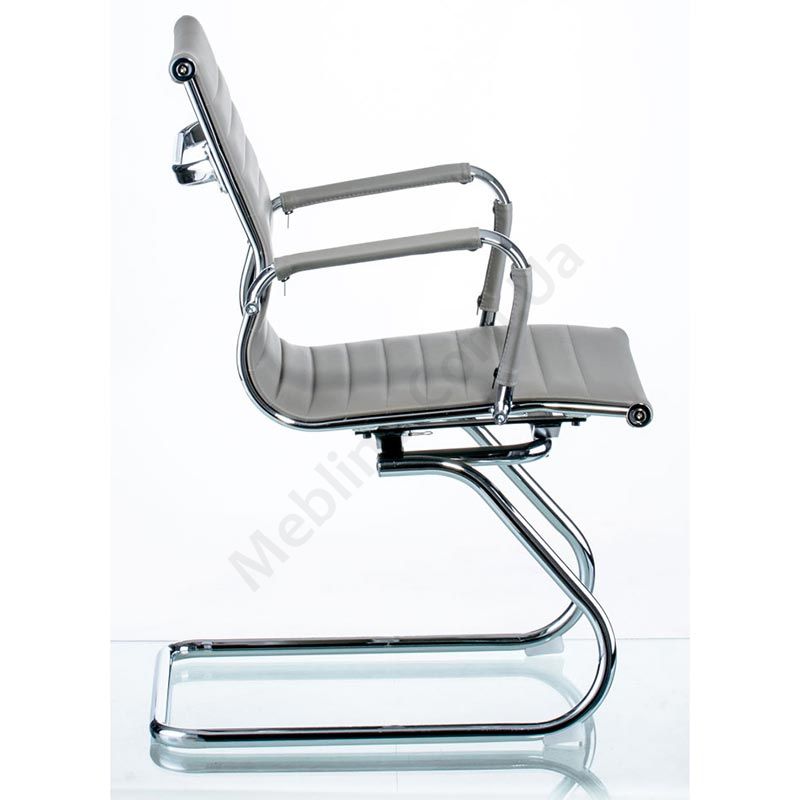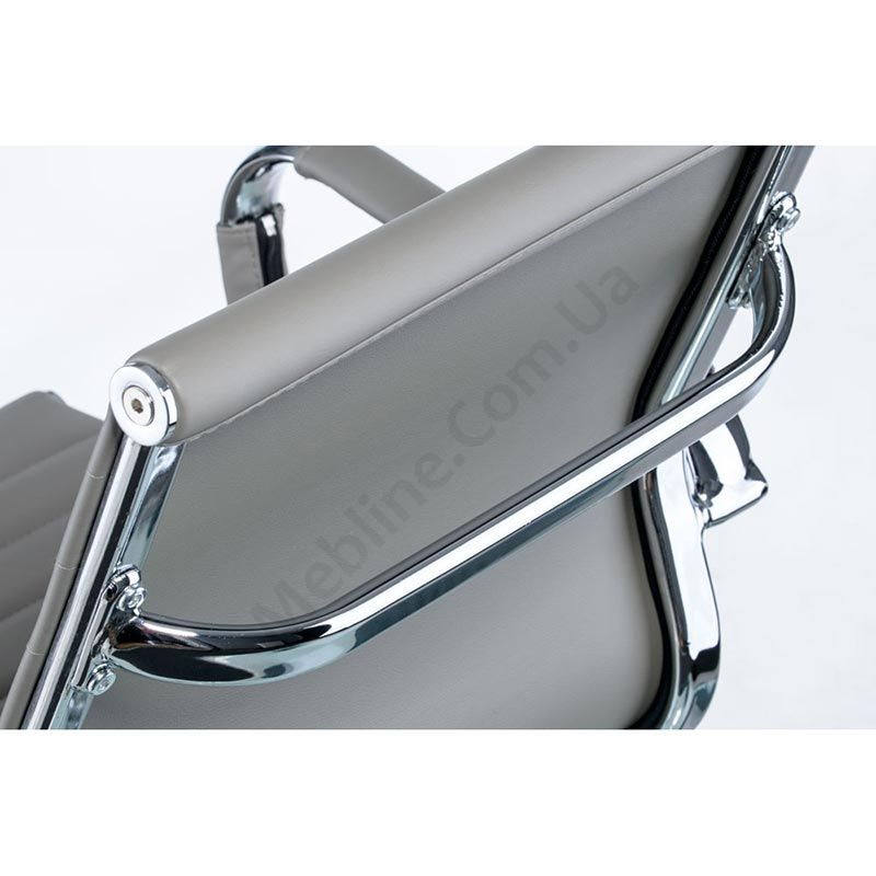 Тонке сіре крісло для конференц-зали з м’якими накладками на підлокітниках.