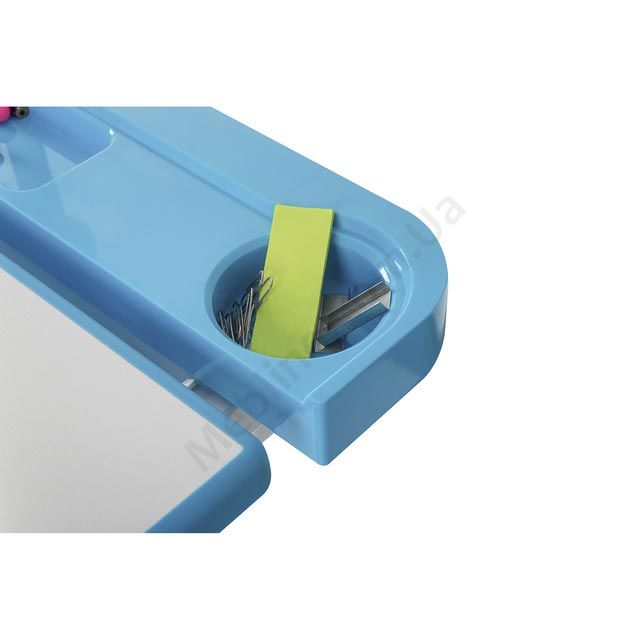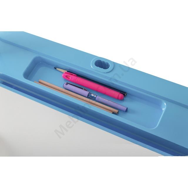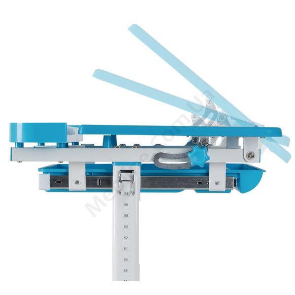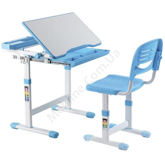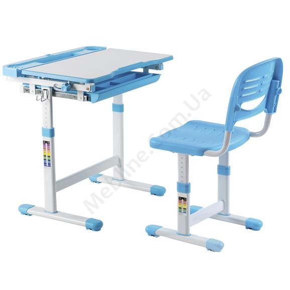 Зростаюча парта зі стільчиком блакитного кольору з шухлядою для зберігання та регулюванням нахилу стільниці.