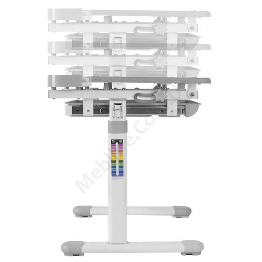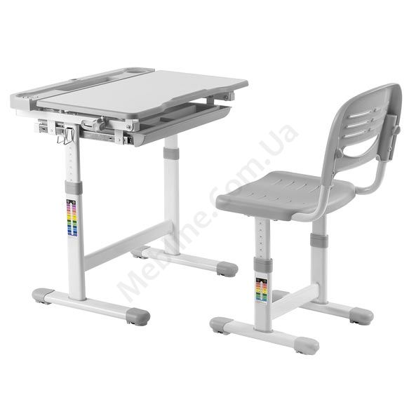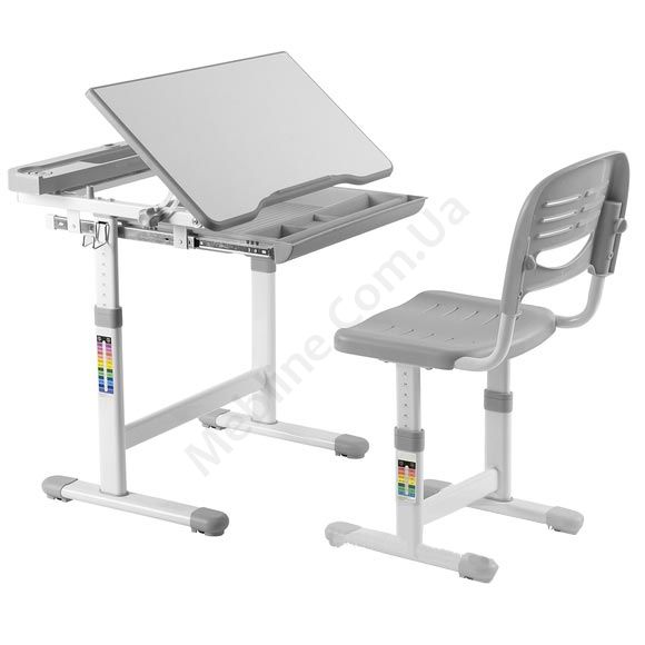 Зростаюча парта зі стільчиком сірого кольору з шухлядою для зберігання та регулюванням нахилу стільниці.
