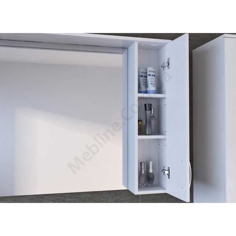 Дзеркало для ванної кімнати з білою шафкою та підсвічуванням.