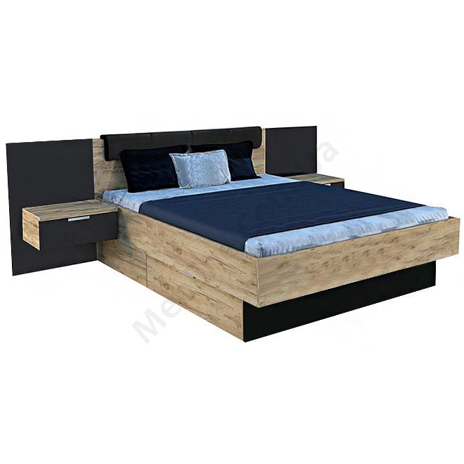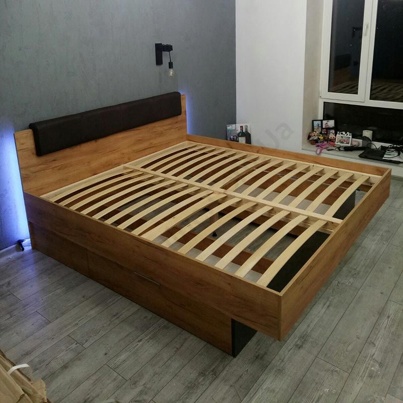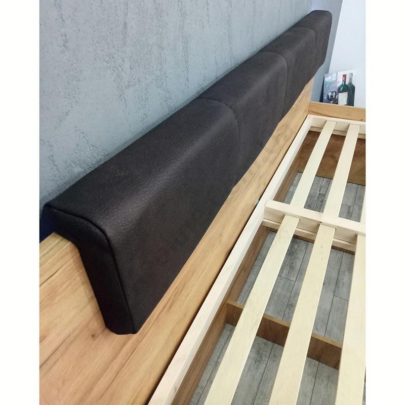 Двоспальне ліжко з м’яким узголів’ям та шухлядами для зберігання.