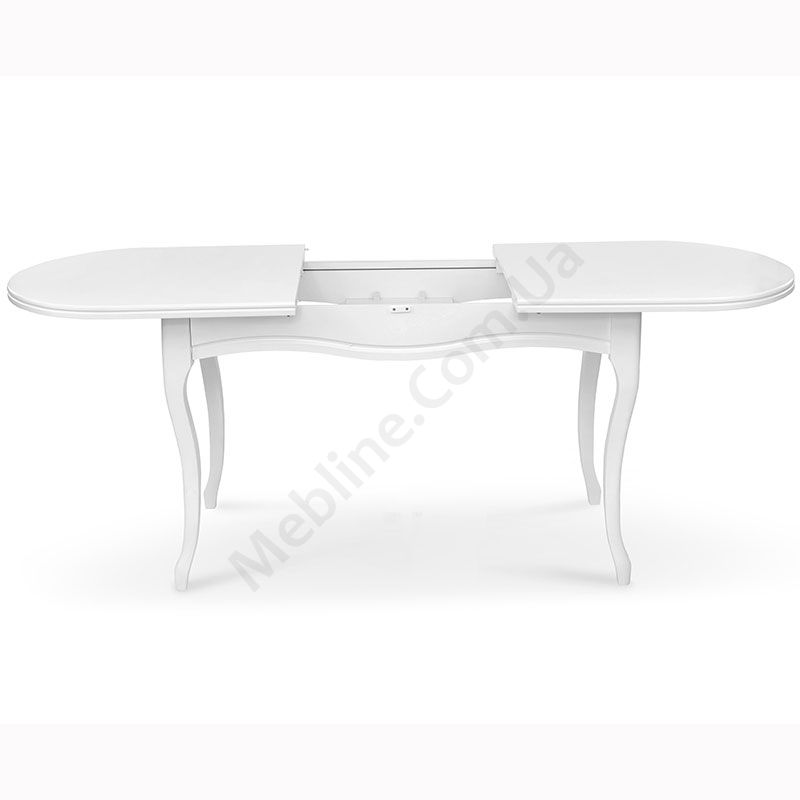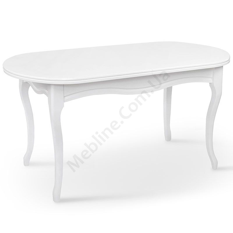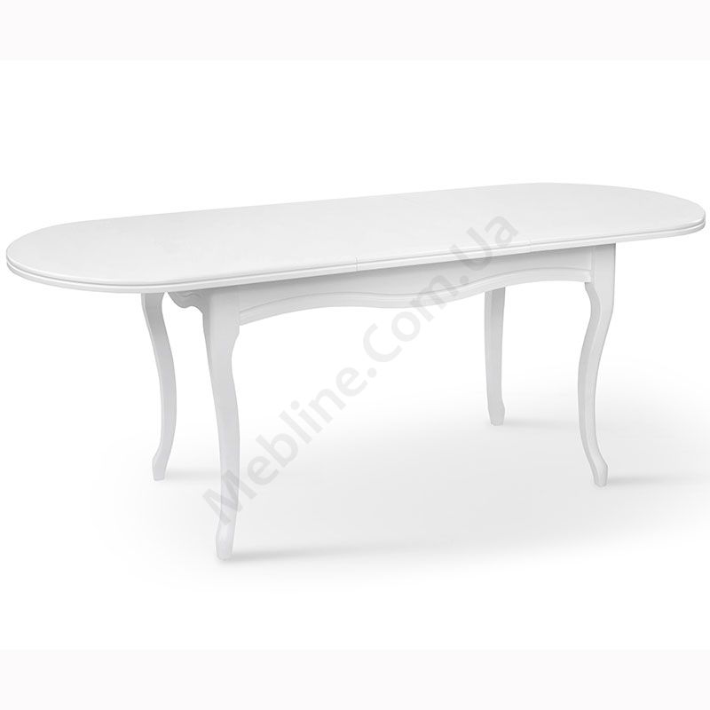 Розкладний обідній стіл овальної форми з натурального дерева білого кольору з вигнутими ніжками.