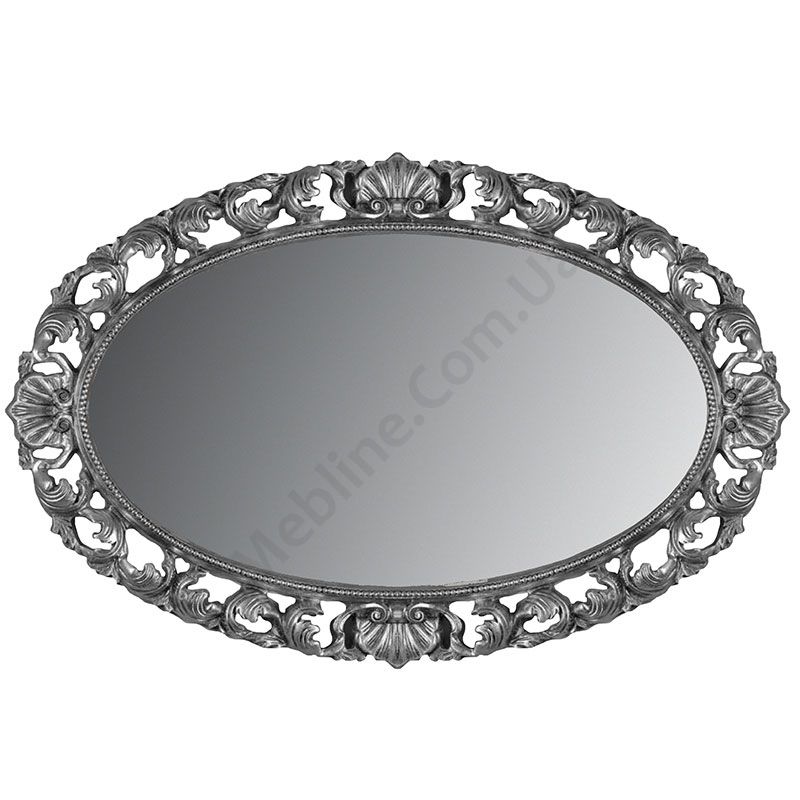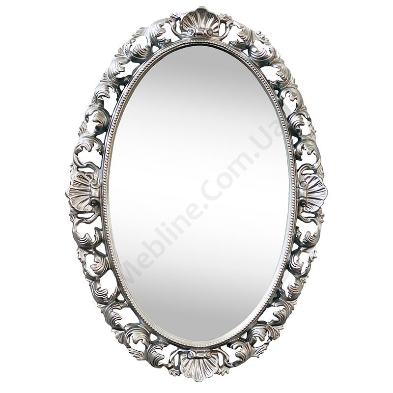 Настінне овальне дзеркало в різьбленій рамі срібного кольору.