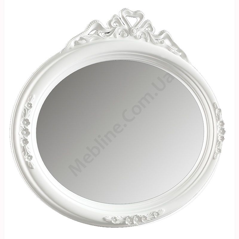 Настінне овальне дзеркало з декором у рамі білого кольору.