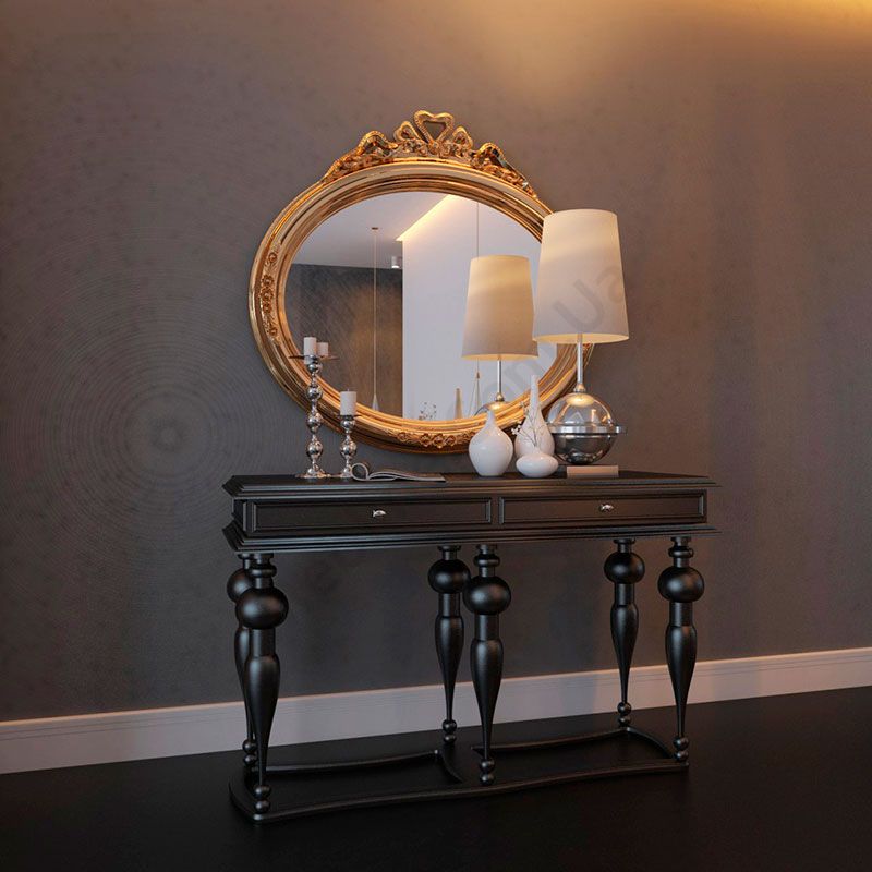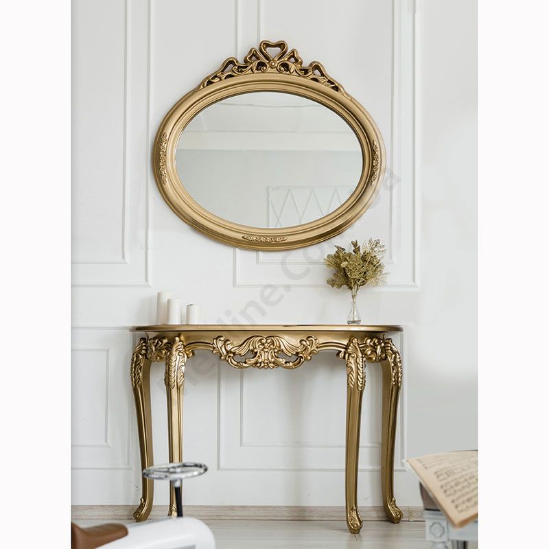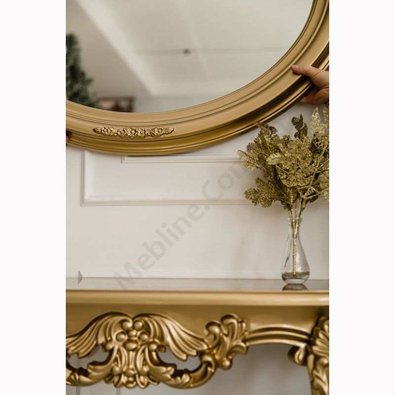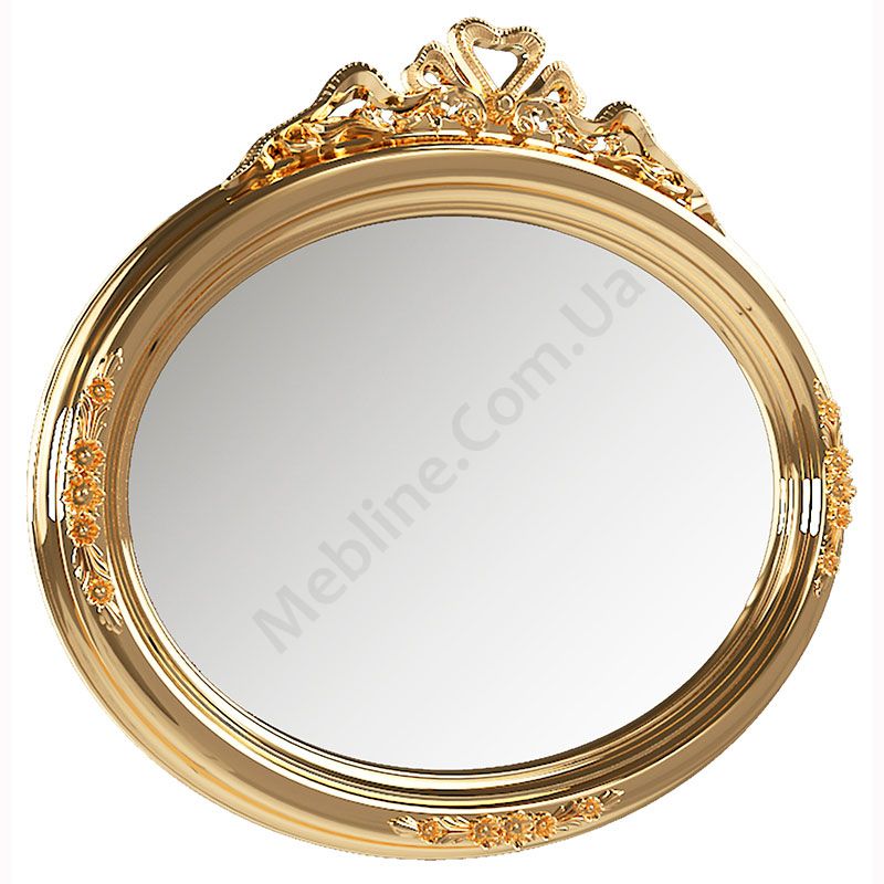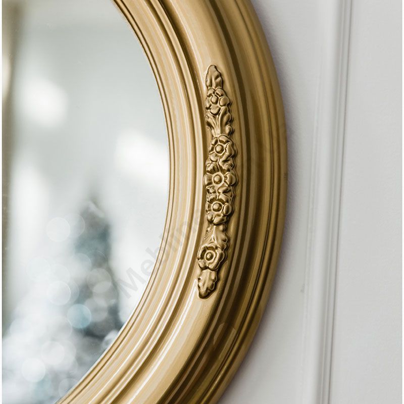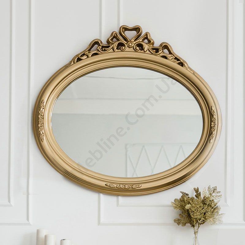 Настінне овальне дзеркало з декором у рамі золотого кольору.