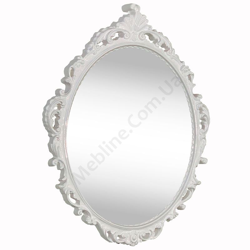 Настінне овальне дзеркало в гарній рамі білого кольору.
