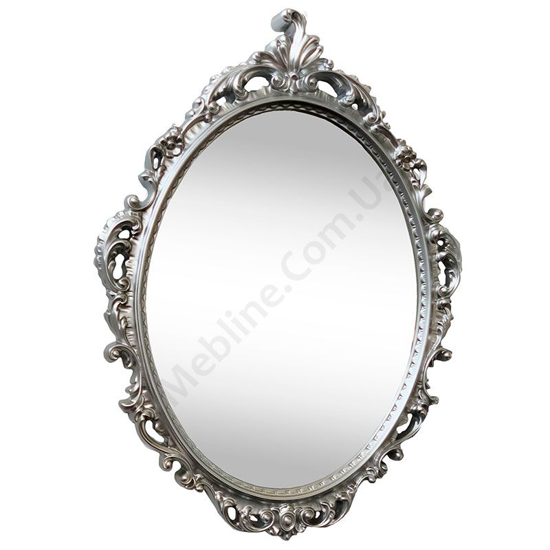 Настінне овальне дзеркало в гарній рамі срібного кольору.