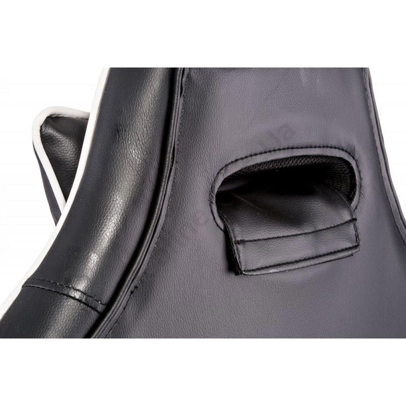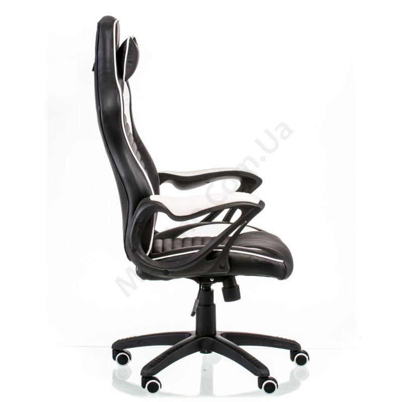 Чорно-біле геймерське крісло з м’якими підлокітниками та підголівником.
