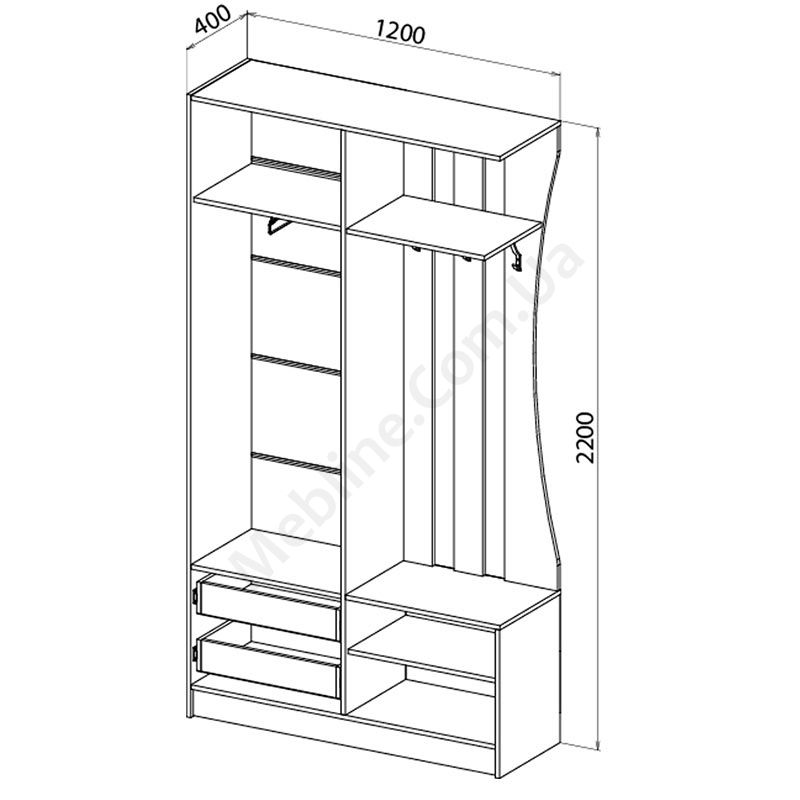 Передпокій з шафою, тумбою для взуття та шухлядами.