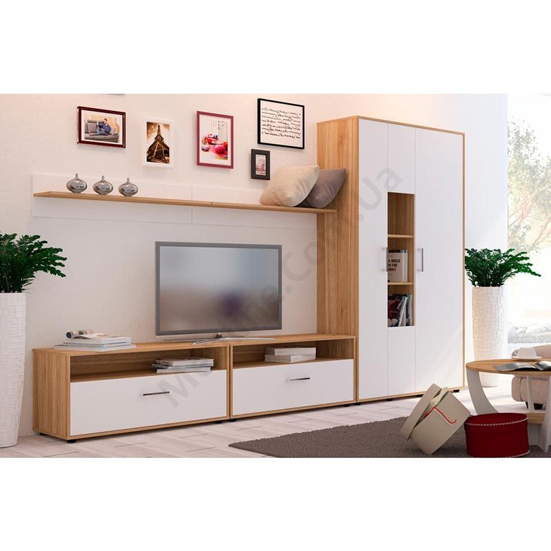 Вітальня зі шафою та тумбою під телевізор.