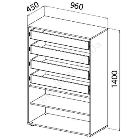 - Комод з чотирма висувними шухлядами та відкидними дверцятами.