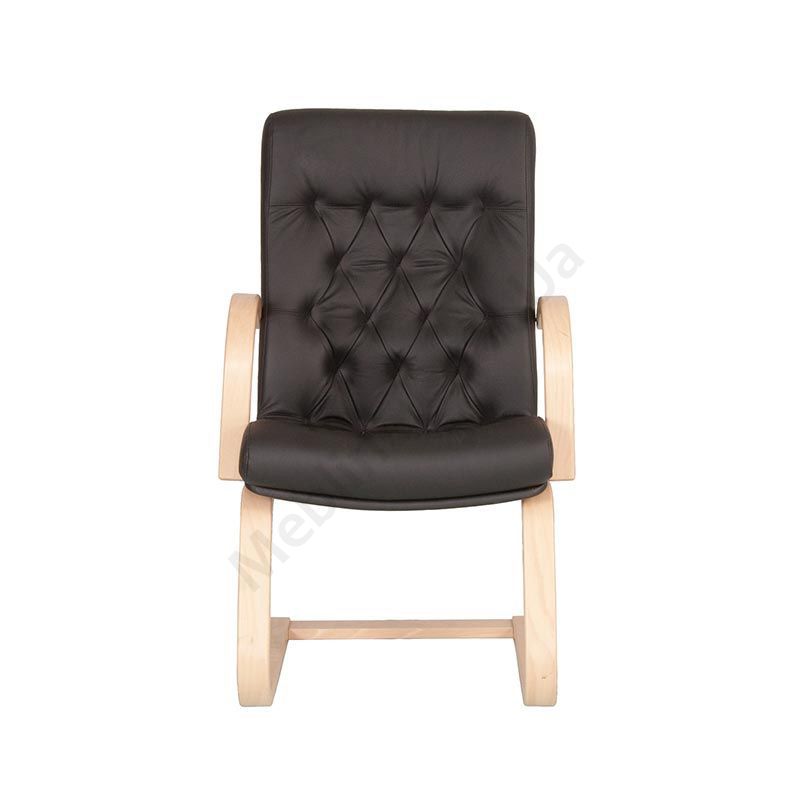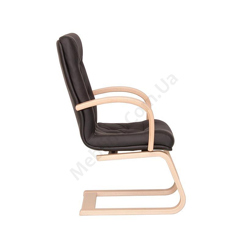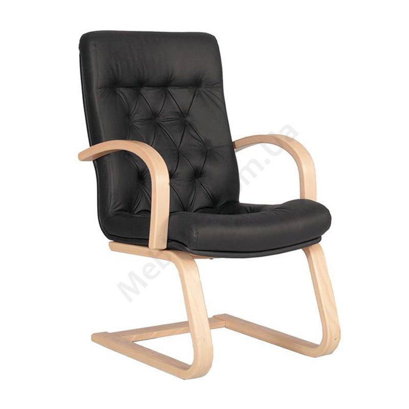 Крісло для конференцій з ромбовидною прошивкою, дерев’яними підлокітниками, на дерев’яній основі.