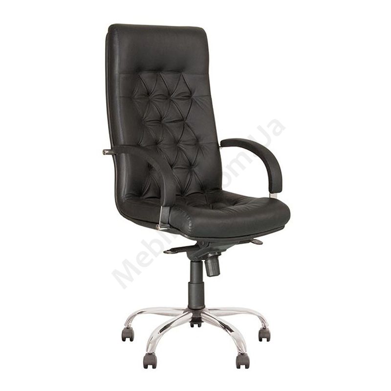 Крісло для керівника з ромбовидною прошивкою, м’якими підлокітниками, фіксацією в 5 положеннях, на хромованій основі.