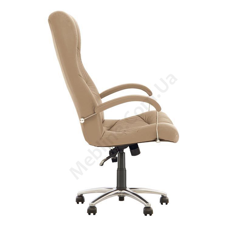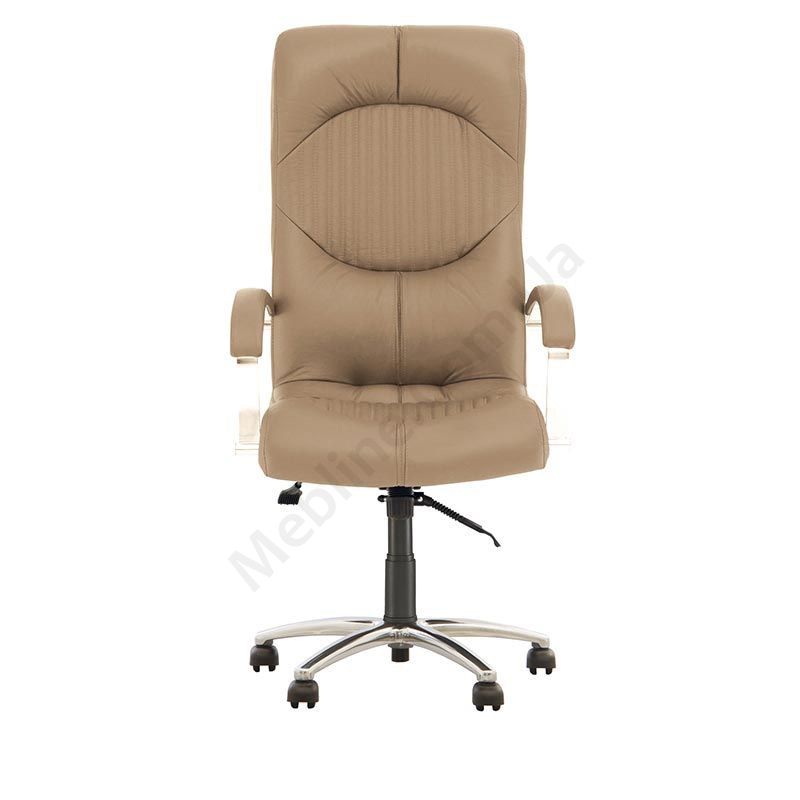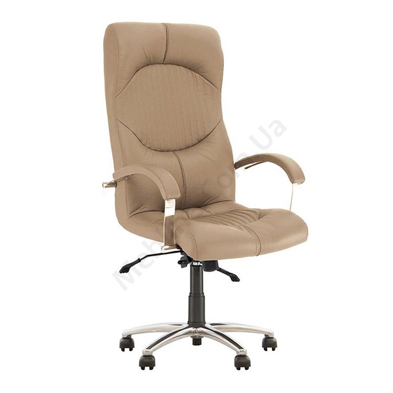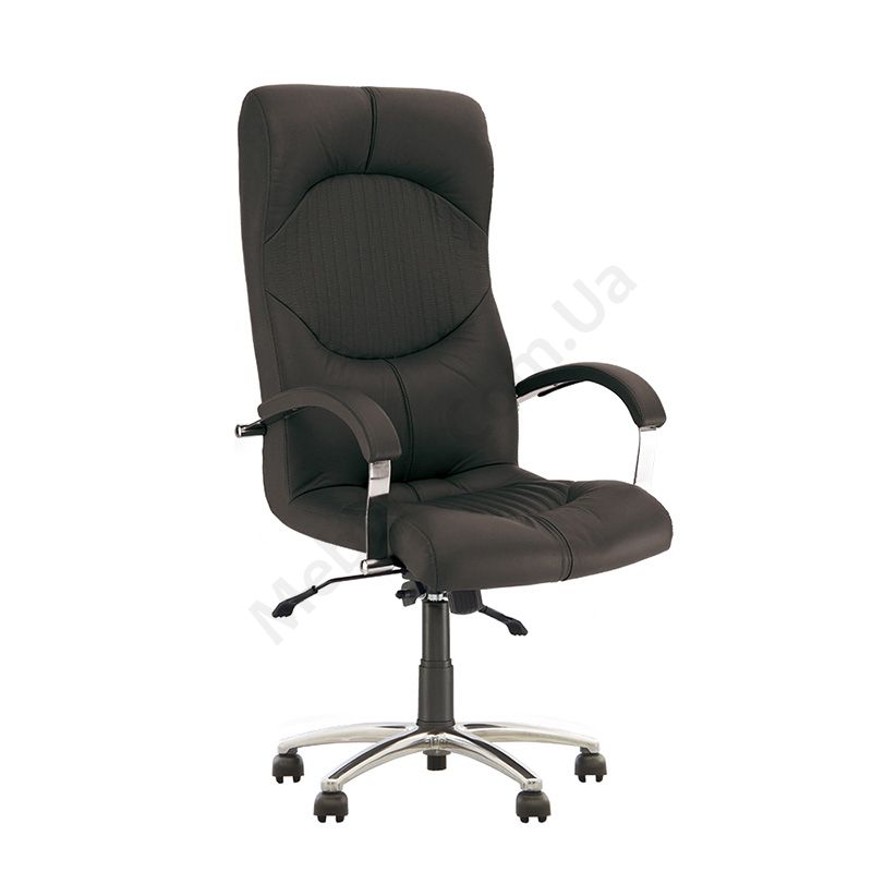 Крісло для керівника з вираженою підтримкою шиї та попереку, фіксацією в будь-якому положенні, м’якими підлокітниками, на алюмінієвій основі.
