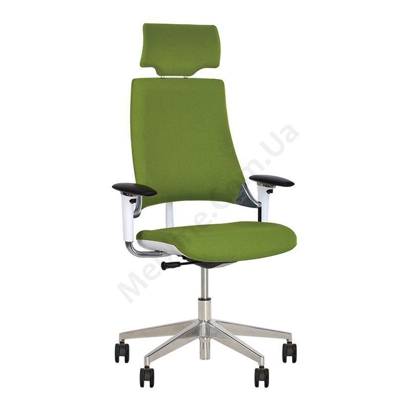 Комп’ютерне поворотне крісло в ексклюзивному дизайні з білими та металевими декоративними елементами, пластиковими накладками на регульованих підлокітниках, регульованим підголівником, фіксацією у 7 положеннях, на алюмінієвій основі.