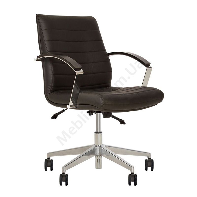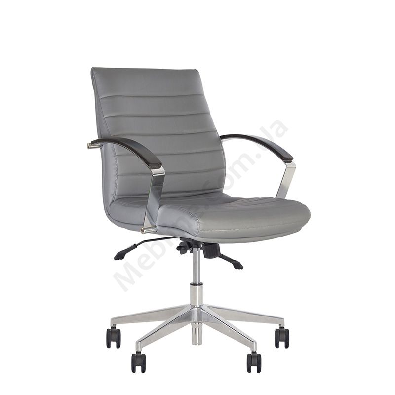 Крісло для керівника з горизонтальною прошивкою, низькою спинкою, дерев’яними підлокітниками, фіксацією в будь-якому положенні, на алюмінієвій основі.