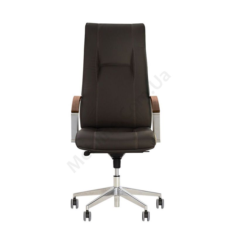 Крісло для керівника ергономічними вигинами, дерев’яними підлокітниками, фіксацією в 5 положеннях, на алюмінієвій основі.