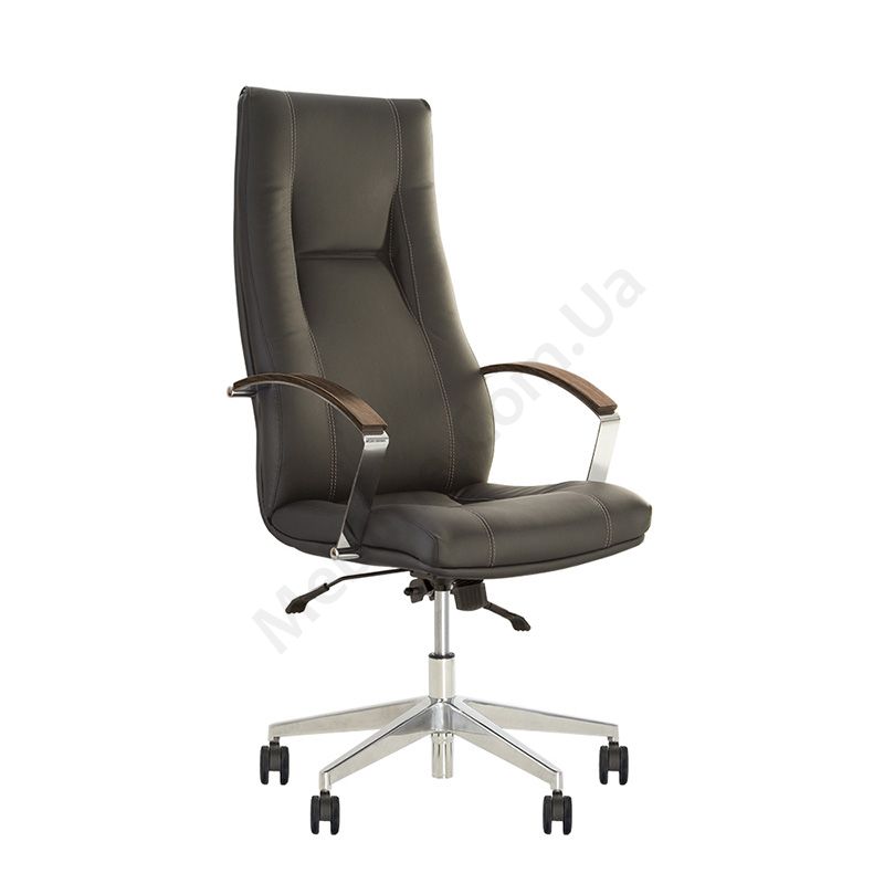 Крісло для керівника ергономічними вигинами, дерев’яними підлокітниками, фіксацією в будь-якому положенні, на алюмінієвій основі.