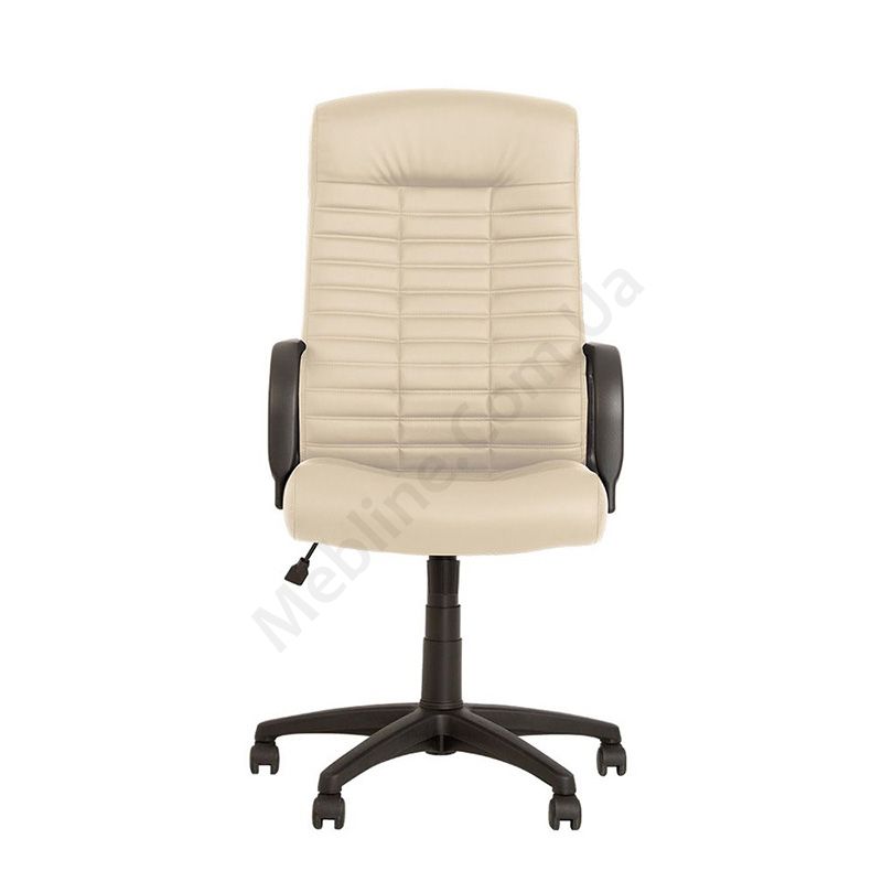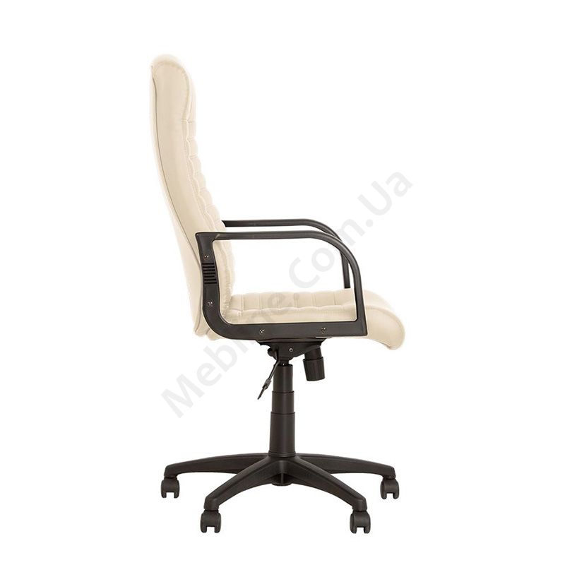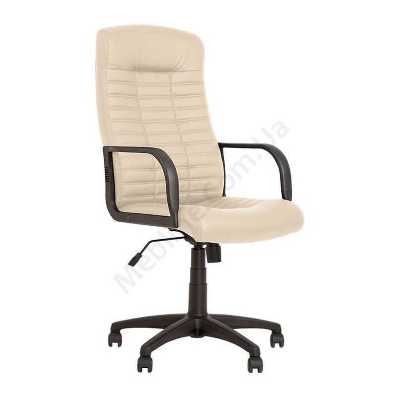 Крісло для керівника з високою спинкою та інтегрованим підголівником, покращеною ергономікою, пластиковим нерегульованими підлокітниками, фіксацією у вертикальному положенні, на пластиковій основі.