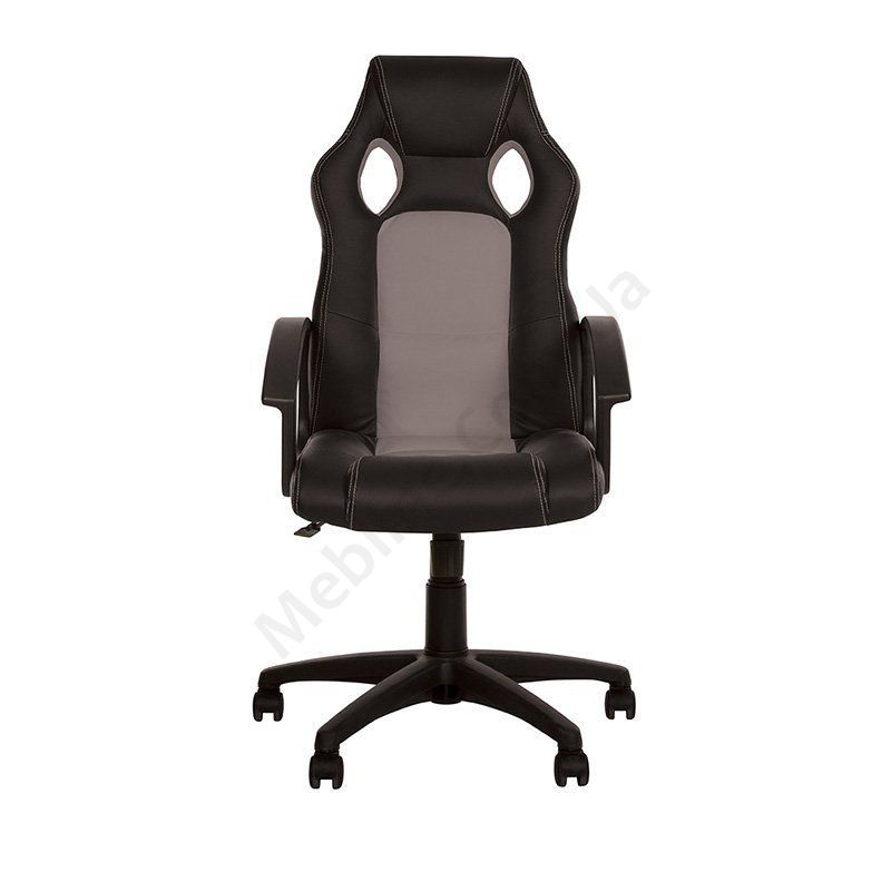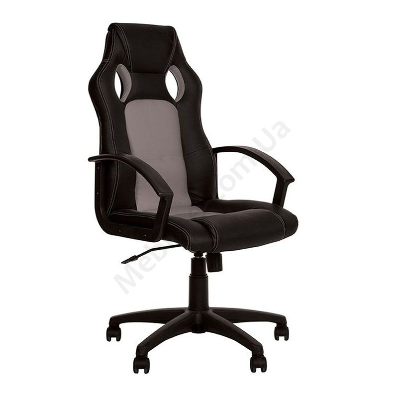 Геймерське крісло в спортивному стилі з пластиковими підлокітниками, фіксацією у вертикальному положенні, на пластиковій основі.