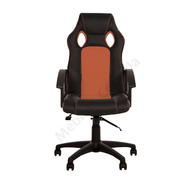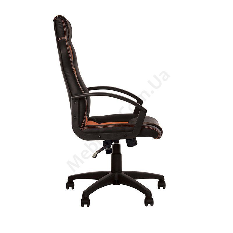 Геймерське крісло в спортивному стилі з пластиковими підлокітниками, фіксацією в будь-якому положенні, на пластиковій основі.